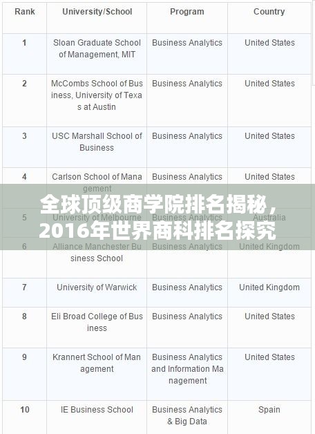 2016年世界商科排名揭示了全球顶级商学院的风采,这些学院在教育教学、科研创新、国际交流等方面取得了卓越的成绩,为全球商界培养了众多杰出人才,对于有志于从事商业领域的学子来说,选择一所优秀的商学院是迈向成功的关键,希望本文为您提供了有价值的参考,助您实现商业梦想。