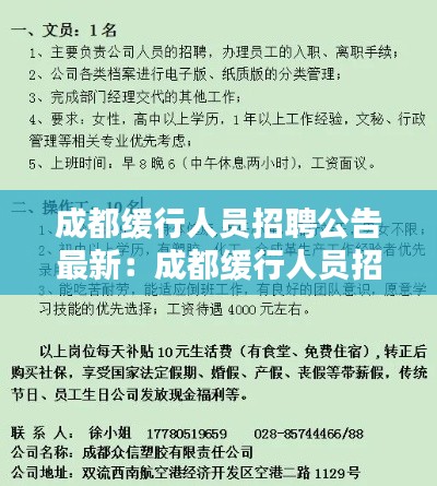 随着我国经济的快速发展和城市化进程的加快,成都作为西南地区的核心城市,正迎来前所未有的发展机遇。为了满足城市建设的需要,缓行人员(即缓行交通管理人员)在维护交通秩序、保障市民出行安全等方面发挥着重要作用。为进一步加强缓行队伍建设,现面向社会公开招聘缓行人员,现将有关事项公告如下: